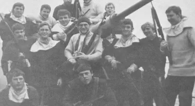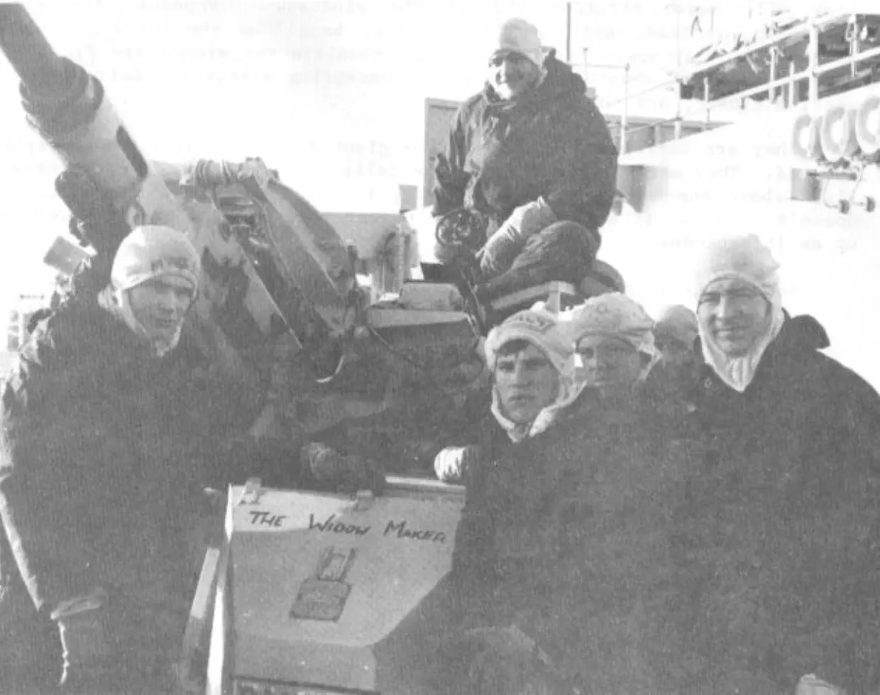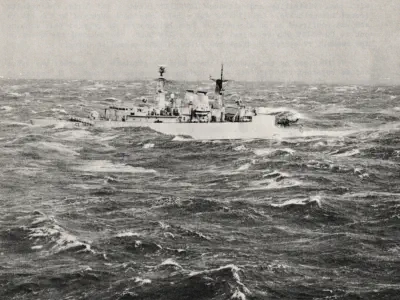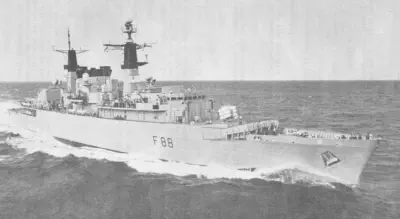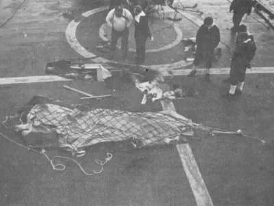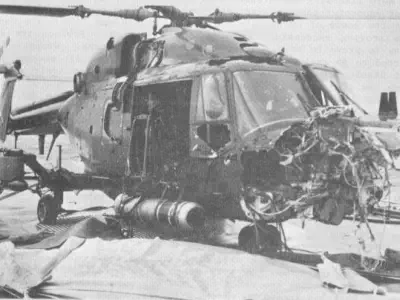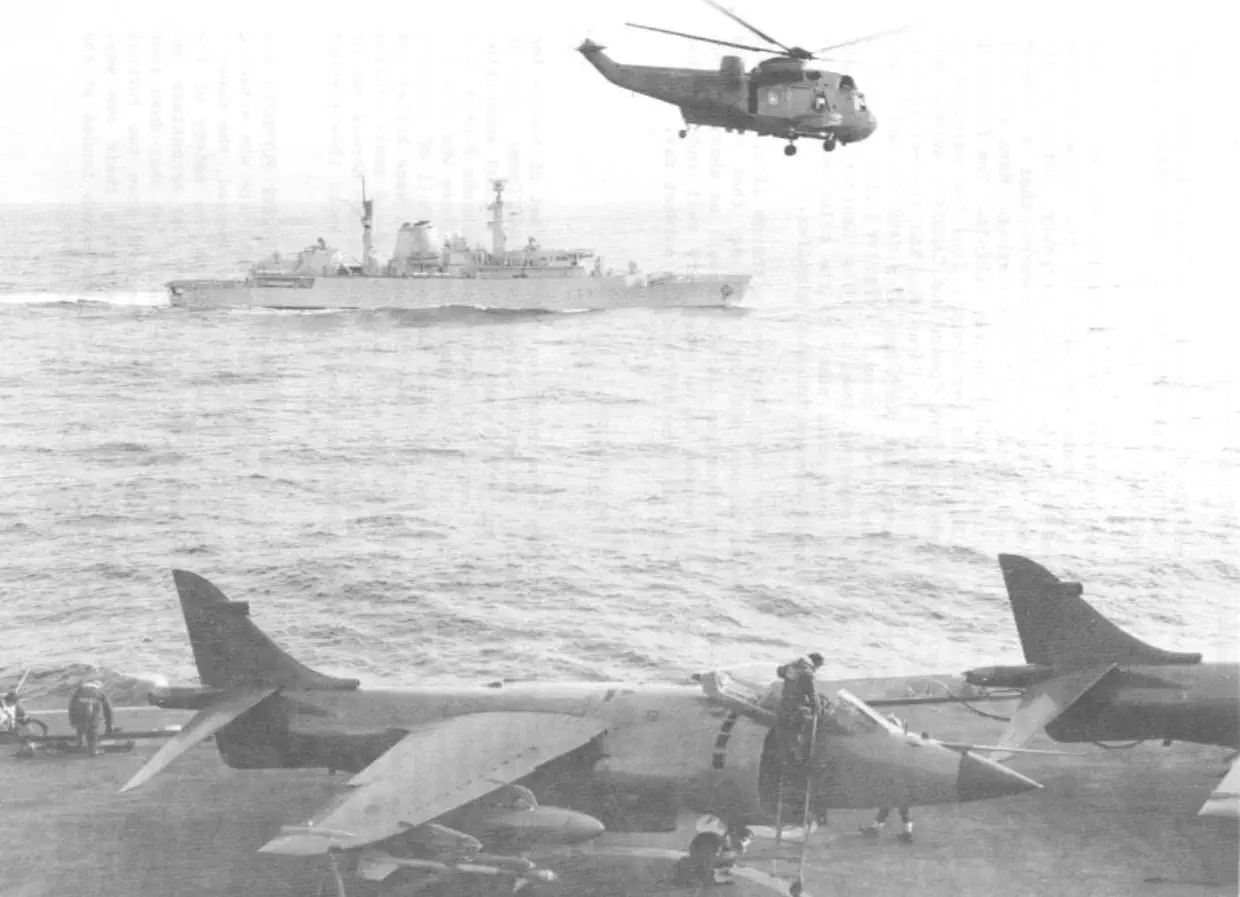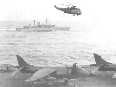 resting his front wheels on her port side, winching men out of liferafts trapped by her Sea Dart launcher. There are a total of