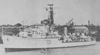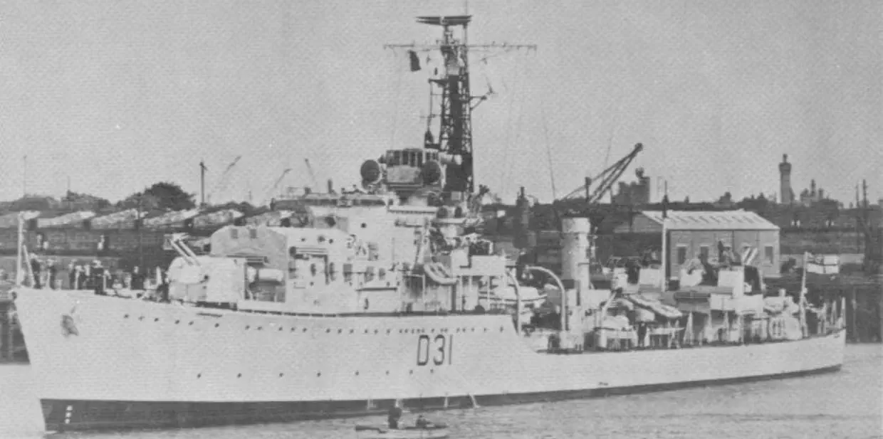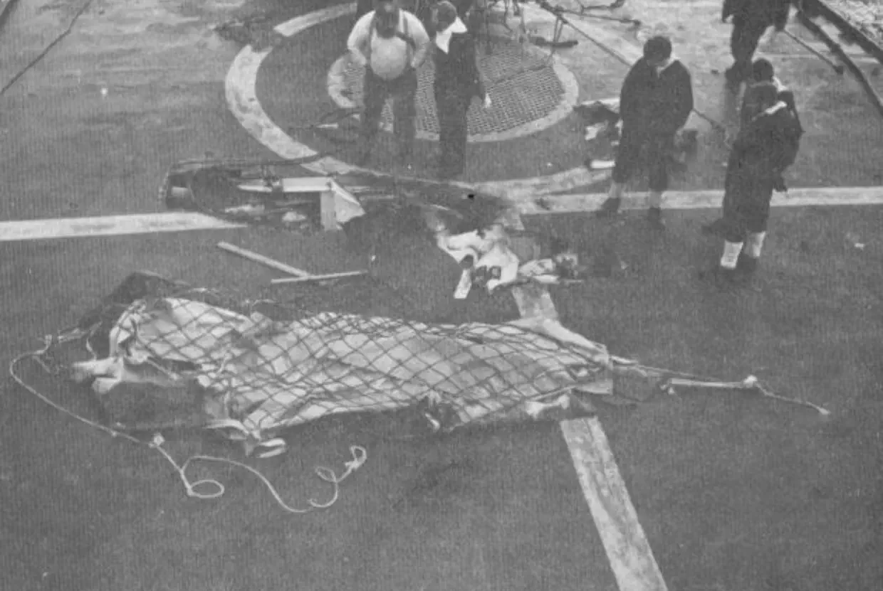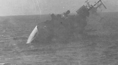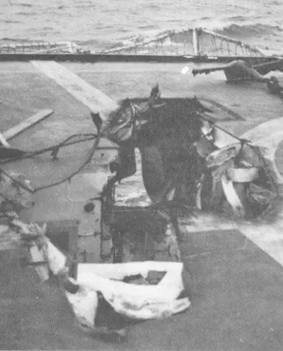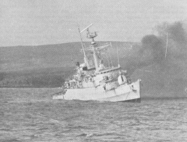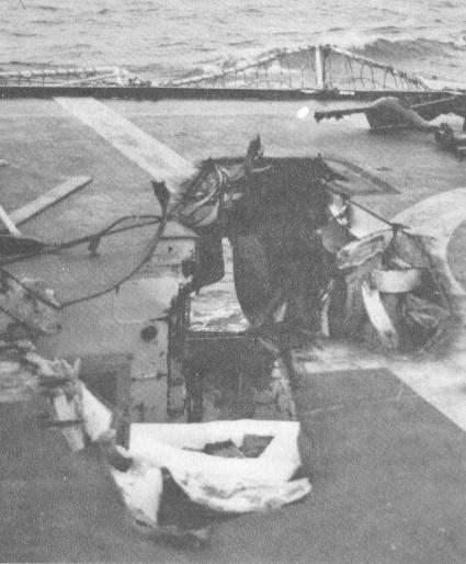 but not before having a good look at ANTELOPEs pole mast, which has been bent virtually double by an exploding A4, taken out by a