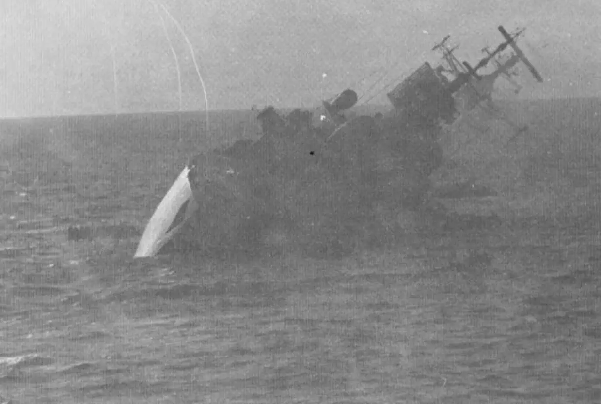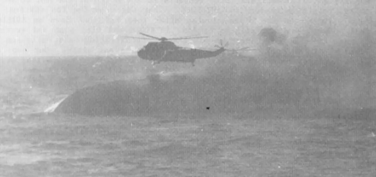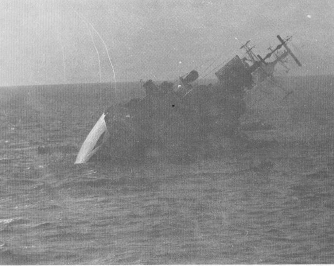 The raids cleared, and we- went to pick up survivors from the now capsizing COVENTRY. She lies on her side, a Wessex 5