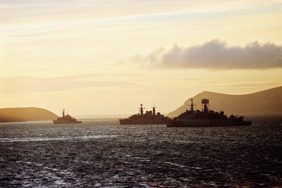 HMS Active, HMS Broadsword, HMS Glamorgan outside San Carlos