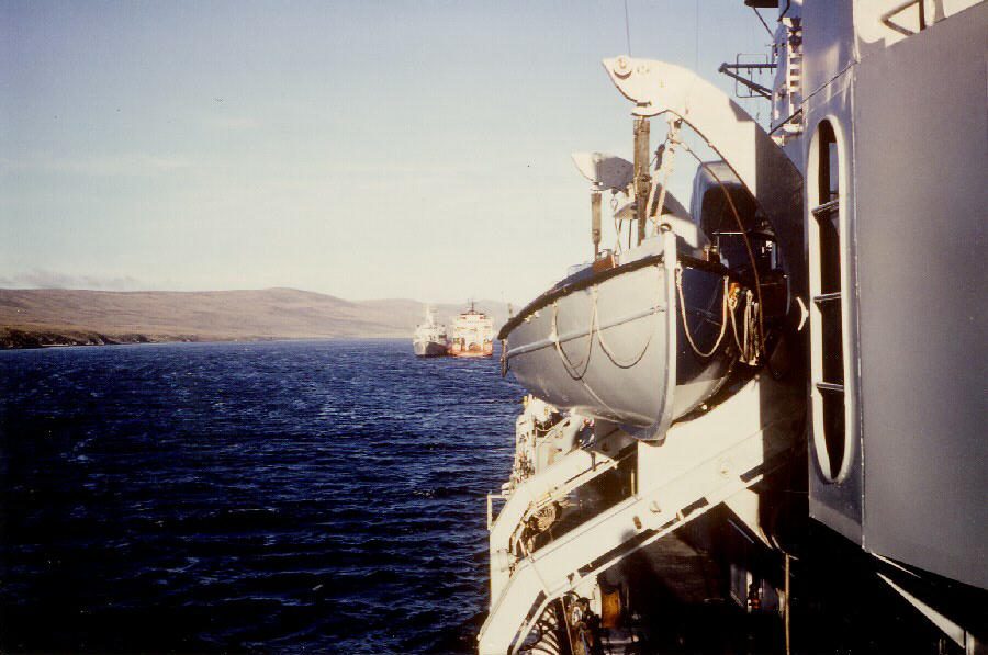 Left - HMS Glamorgan being repaired by MV Stena Inspector (right) after being damaged by an Exocet missile while engaged in shore bombardment. Taken from HMS Broadsword in San Carlos water, May 1982. Courtesy Darby Allen.