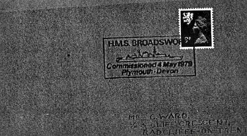As you can see it is a first day issue envelope + stamp, with Broadsword Stamp on the commissioning day of the Type 22 Broadsword addressed to a Mrs. C Ward. I have checked my ships company lists and find no mention of a ward serving on the first commission but found three others on later commissions, possibly there is a connection but we now own it and we will be auctioning it at the reunion Dinner for those that are interested, all proceeds will go to the Broadsword Association.