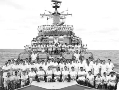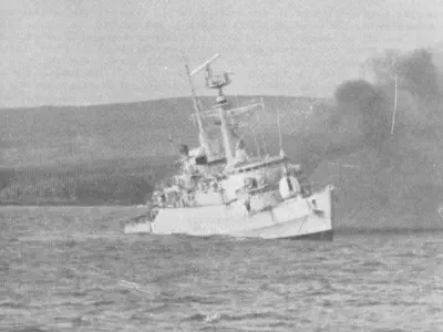 but not before having a good look at ANTELOPEs pole mast, which has been bent virtually double by an exploding A4, taken out by a