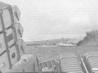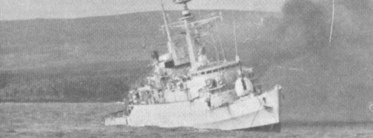 disappearing over the hill and into San Carlos Water itself, where it fired rockets at ARGONAUT, and escaped apparently unscathed