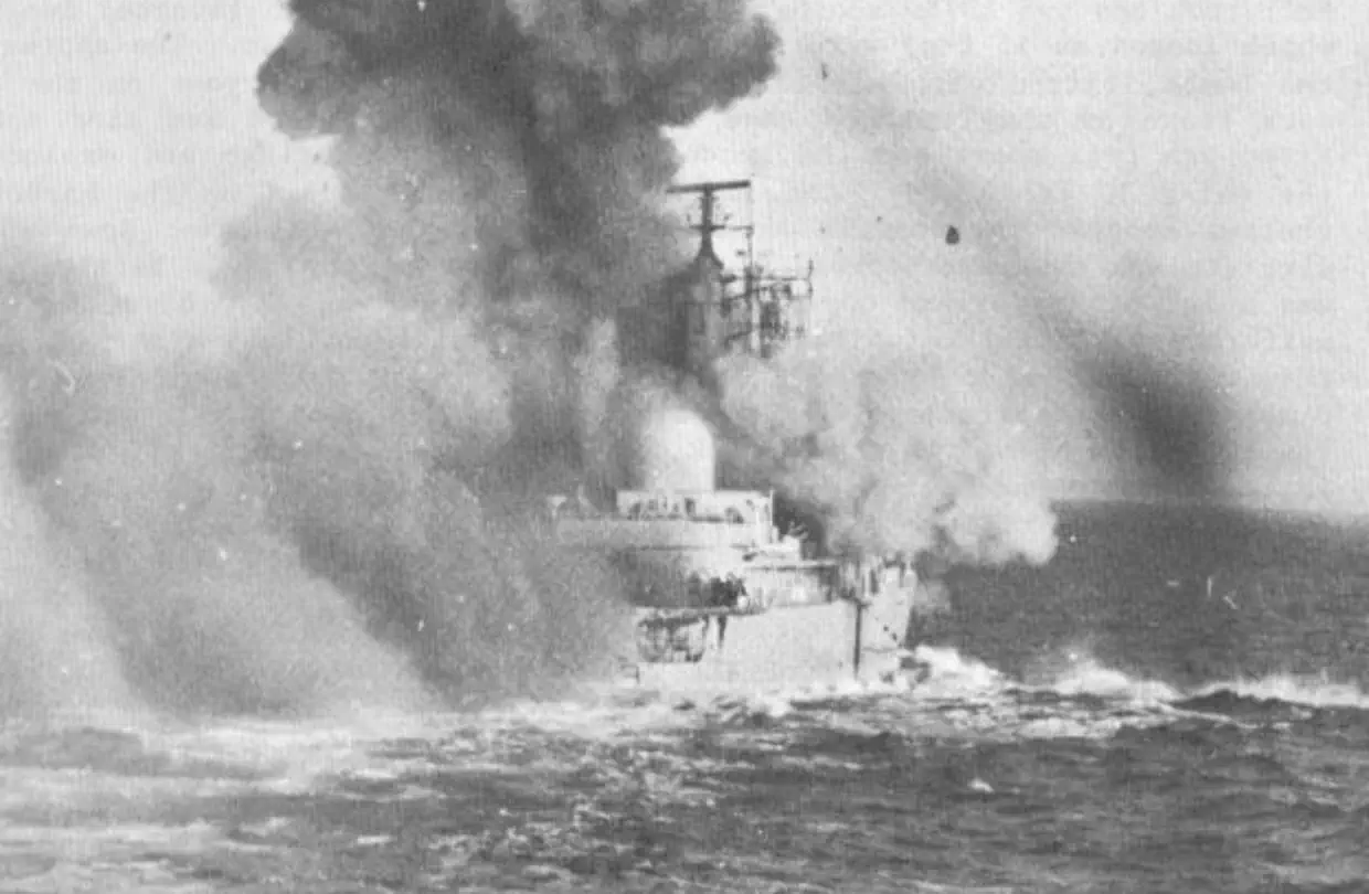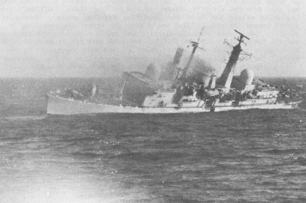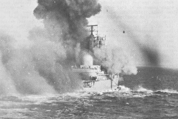 deck, taking with it the nose of XZ 729; 1825, COVENTRY has been hit and was listing to port.