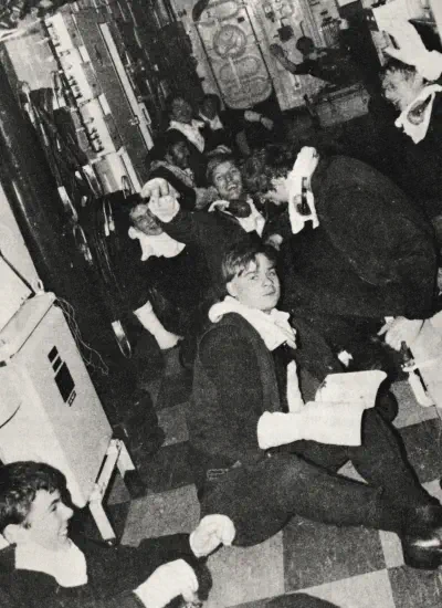 minus anti-gas respirators, were in two minds whether or not to leap over the side and try to swim for it. The mere fact that